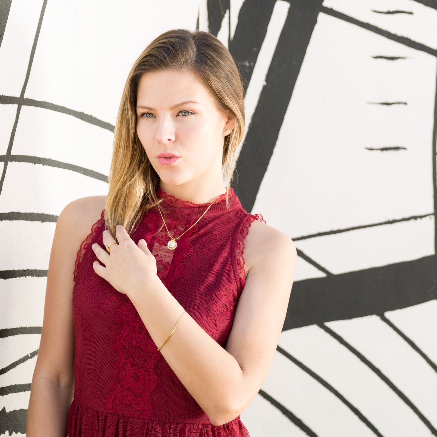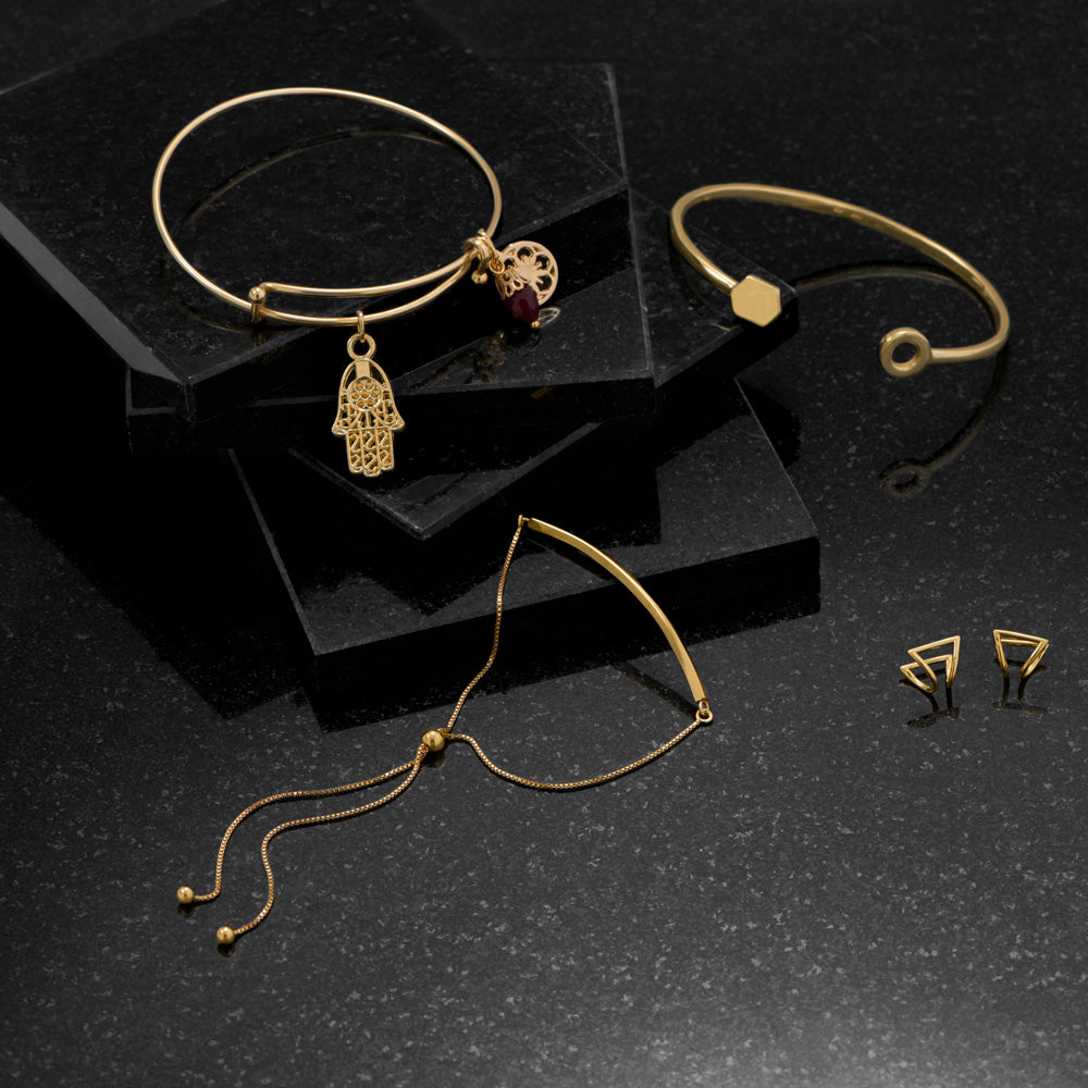 Adjustable 14 karat gold plated sterling silver box chain bracelet with a 2mm x 47mm polished bar. The bracelet adjusts with a 4mm 14 karat gold plated sterling silver bead. Bracelet adjusts to 9.25". .925 Sterling Silver