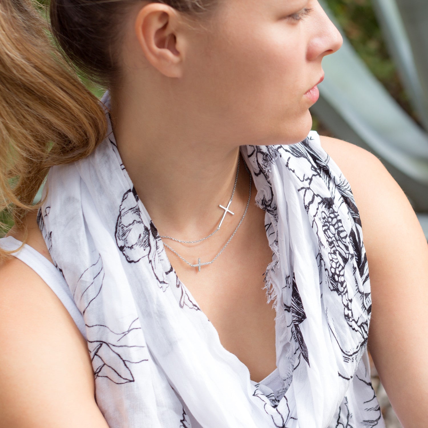 16" + 2" extension rhodium plated sterling silver necklace with clear CZ sideways cross. The CZ cross is approximately 11mm x 15mm. This necklace has a spring ring closure. .925 Sterling Silver