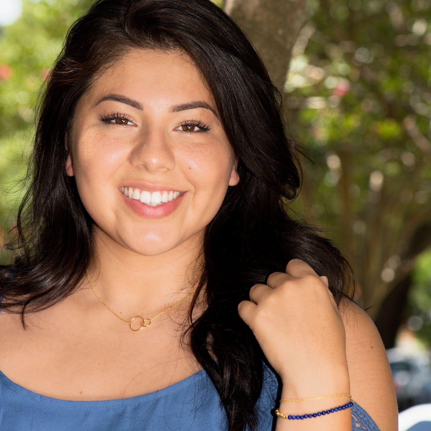 16" + 2" extension 14 karat gold plated sterling silver necklace with a small and large circle link center. The circles are approximately 10mm and 16mm. The necklace has a lobster clasp closure. .925 Sterling Silver