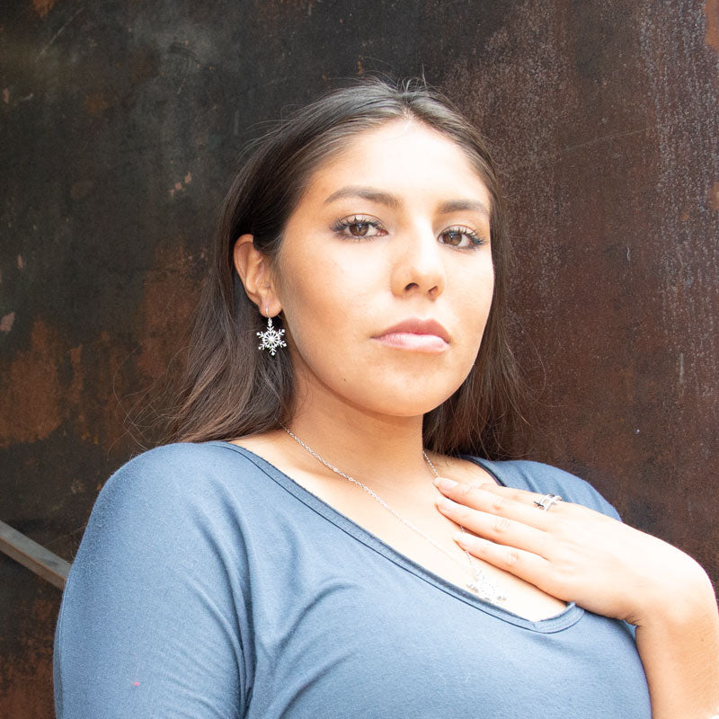Let it snow! Pretty rhodium plated sterling silver french wire earrings. Snowflakes measure 19.1mm x 21.7mm with pops of sparkle from 1.2mm CZ's throughout. Hanging length is 33mm. .925 Sterling Silver