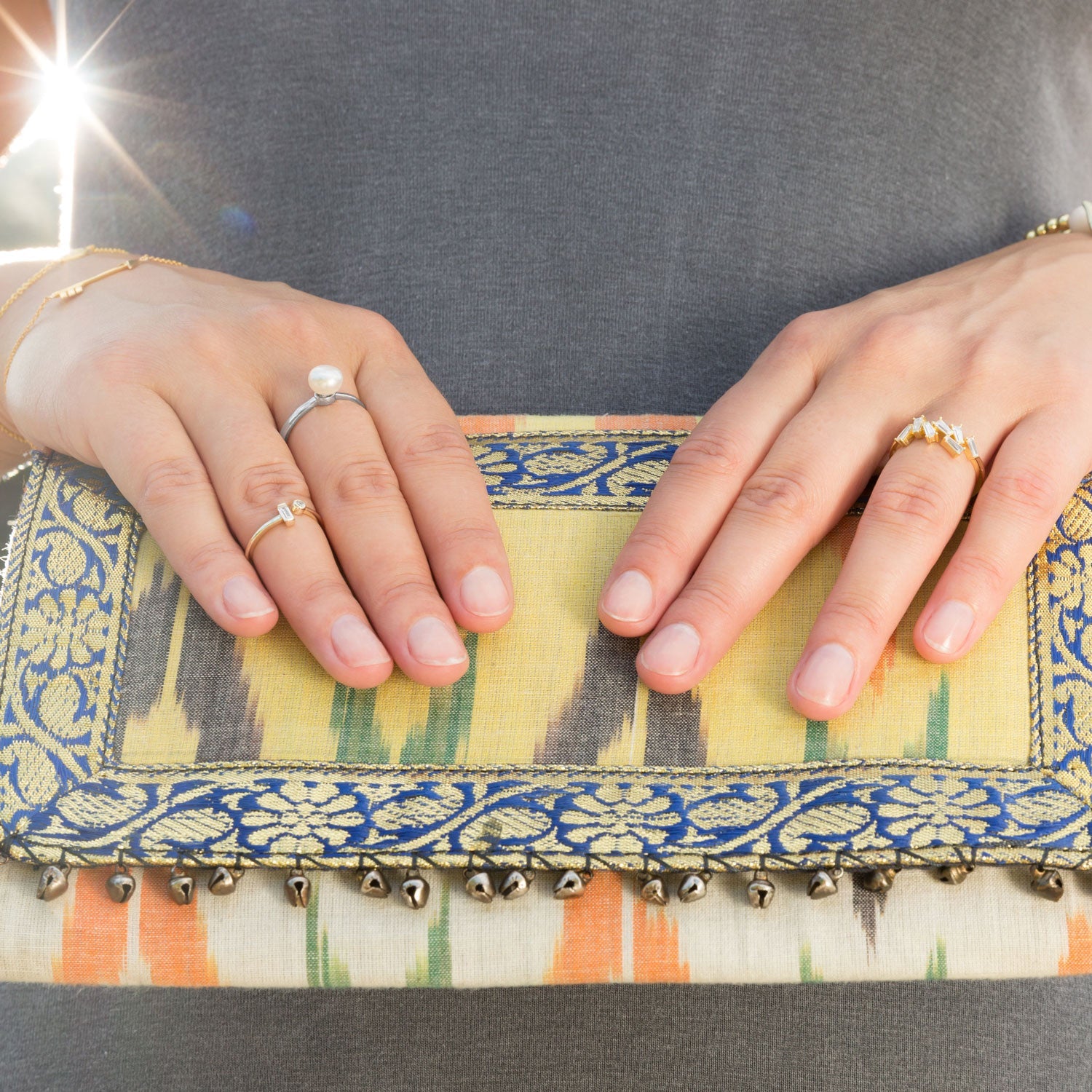14 karat gold plated sterling silver ring with an open design featuring round CZ and baguette CZ ends. The round CZ end is 2.85mm and the baguette CZ end is 2mm x 4.85mm. The band is 1.5mm. Available in whole sizes 5-9. .925 Sterling Silver