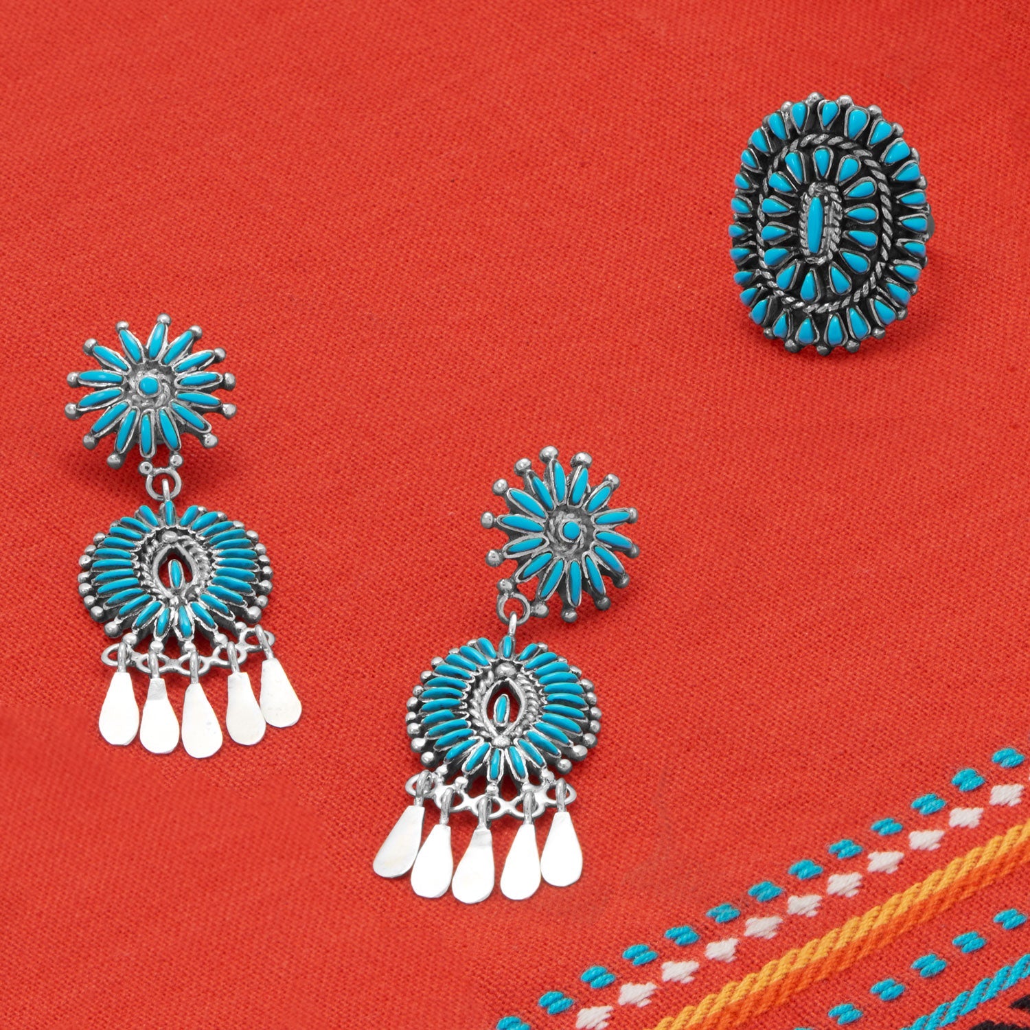 This stunning southwest style turquoise ring echoes the desert's timeless allure! 6.2mm x 1.8mm and 3.3mm x 1.8mm stabilized blue turquoise from Arizona 29.5mm x 23.1mm sunburst design Available in whole sizes 6-9 Handmade in the USA .925 Sterling Silver