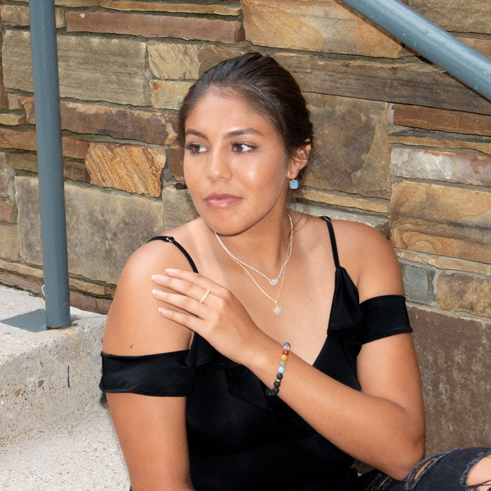 Chakra stone bracelet. 8.5mm black lava bead fashion stretch bracelet with 8mm faceted amethyst, clear quartz, carnelian, yellow jasper, green aventurine, blue quartz, and silver tone accent spacers. Stone colors may vary. Fashion jewelry contains base metal.